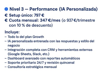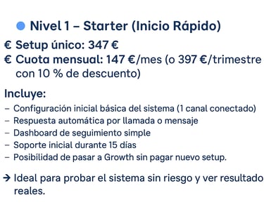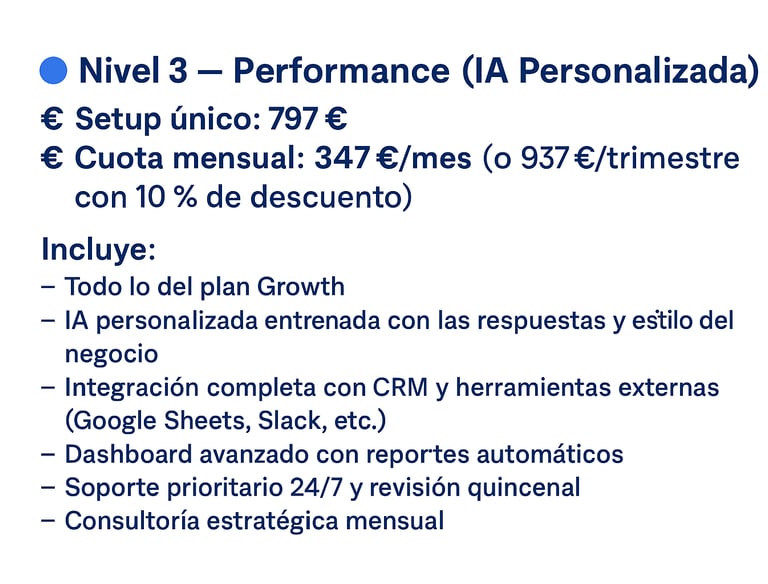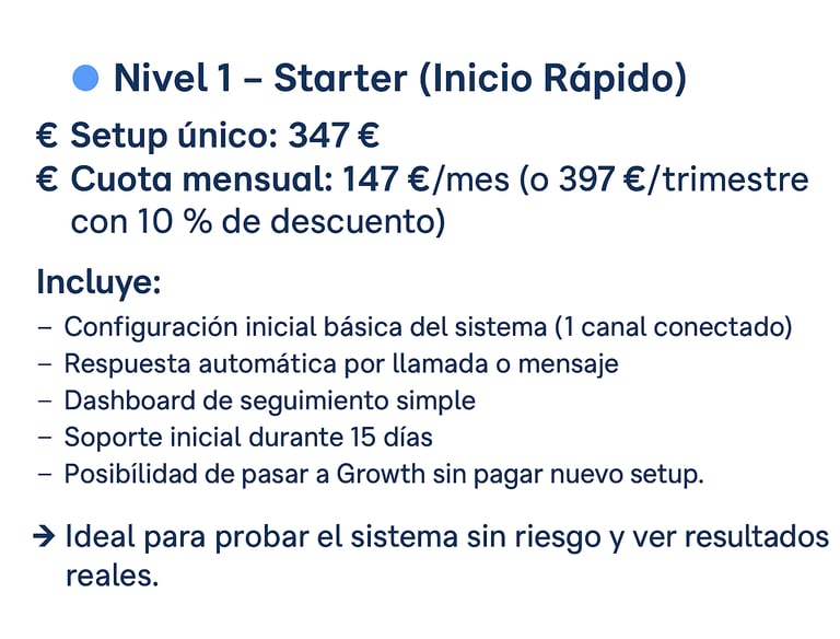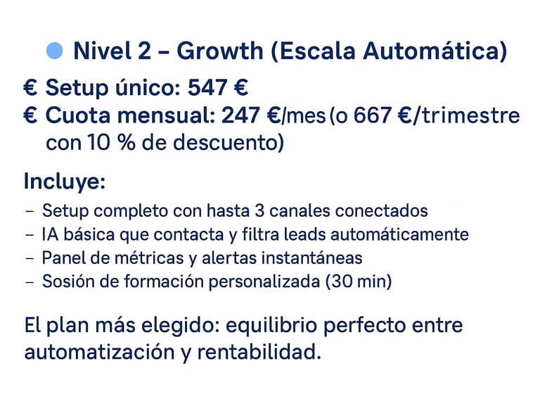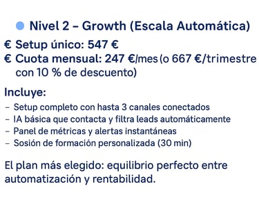 Desde una prueba sencilla hasta un sistema completo con IA personalizada. Tú eliges el ritmo, nosotros lo automatizamos todo.